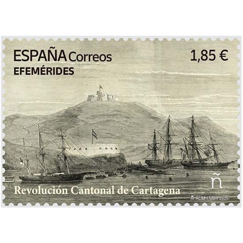 La revuelta cantonal suscitó el recelo de la mayoría de las potencias europeas, que temieron una nueva reedición de la recién reprimida “Comuna de París”, y sus flotas colaboraron en el bloqueo marítimo a Cartagena. Las revistas ilustradas francesas y británicas dieron noticia puntual de los sucesos de la insurrección, uno de cuyos grabados sirve de motivo para la emisión de este sello de Correos, tras cumplirse el 150 aniversario del final del Cantón de Cartagena.