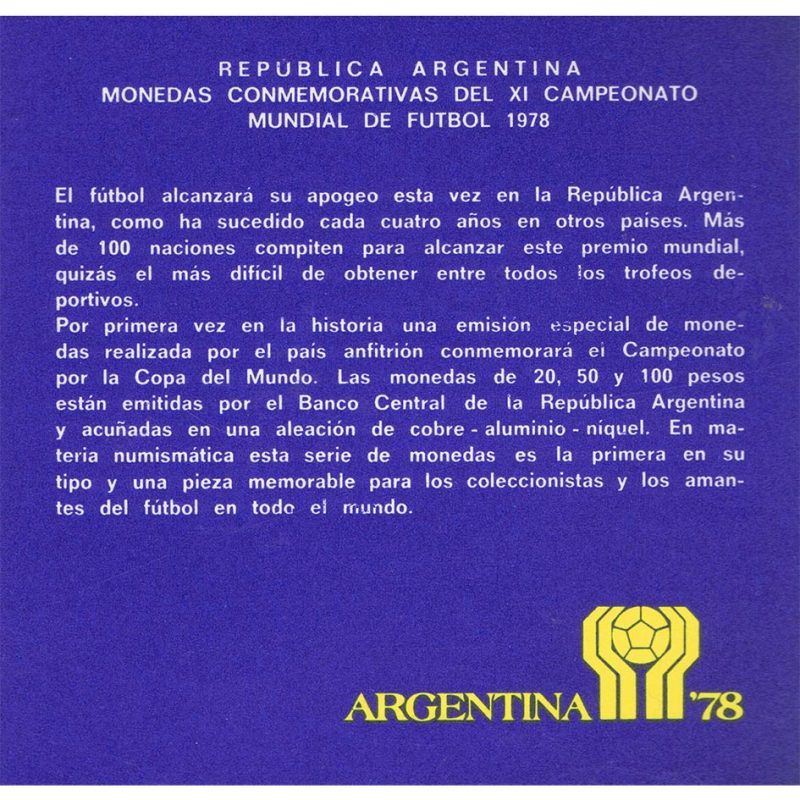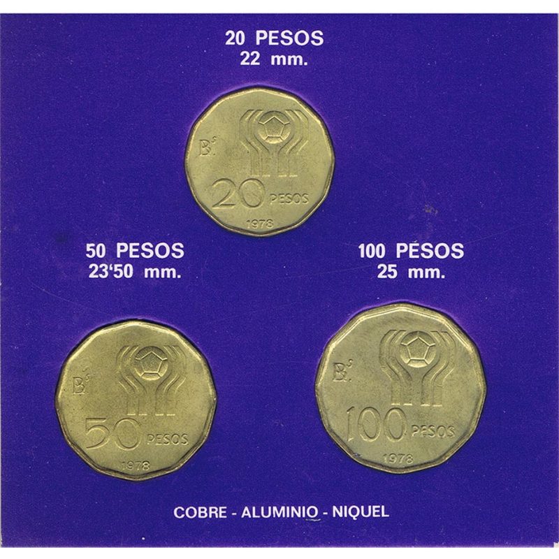 Colección de 3 monedas de 20, 50 y 100 pesos, emitidas con motivo de La Copa Mundial de la FIFA Argentina 1978.