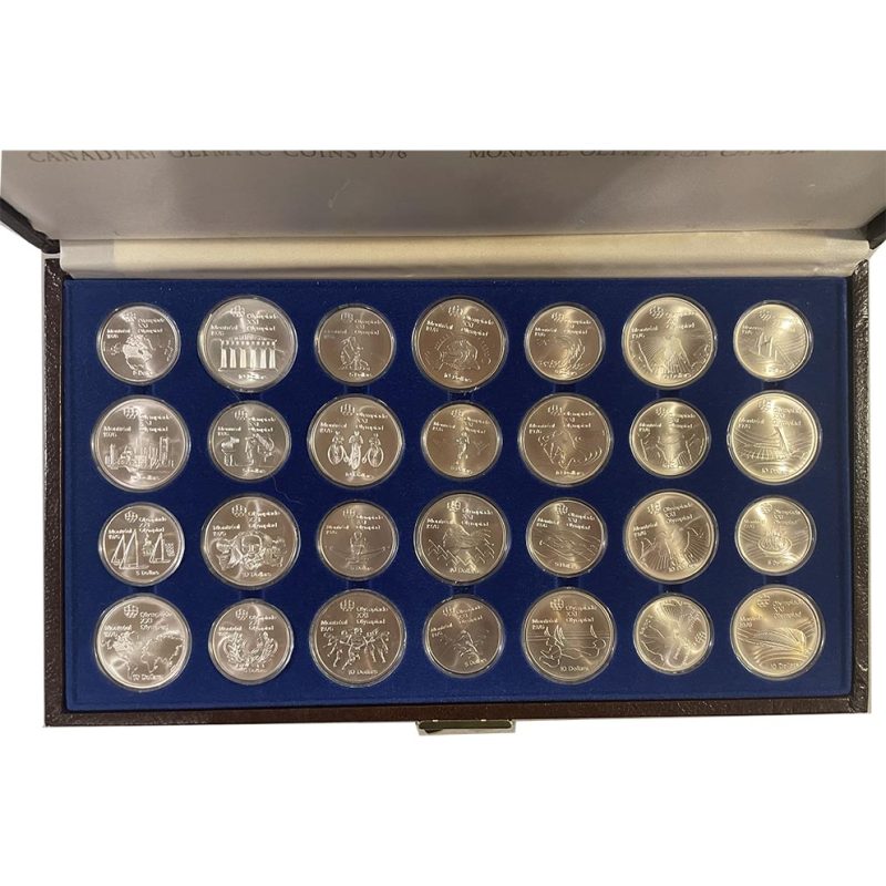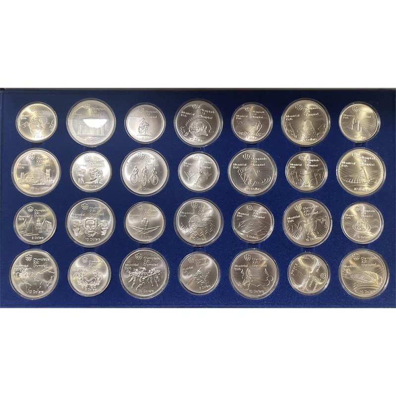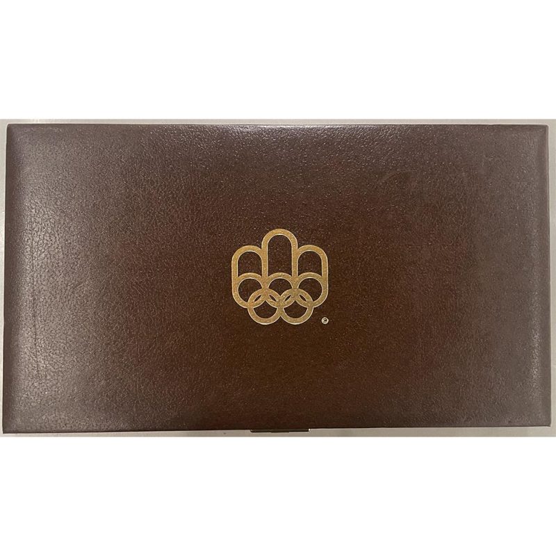 Estuche conteniendo las 28 monedas de plata conmemorativas de las Olimpiadas de Montreal 1976.