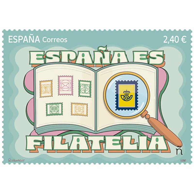 El diseño de ESPAÑA ES FILATELIA es una ilustración que representa un álbum donde los coleccionistas guardan y protegen sus sellos. El álbum es el cofre donde están los pequeños tesoros de cada coleccionista y que nos conectan con otras personas cuando intercambiamos, comentamos o participamos en ferias o foros filatélicos.
