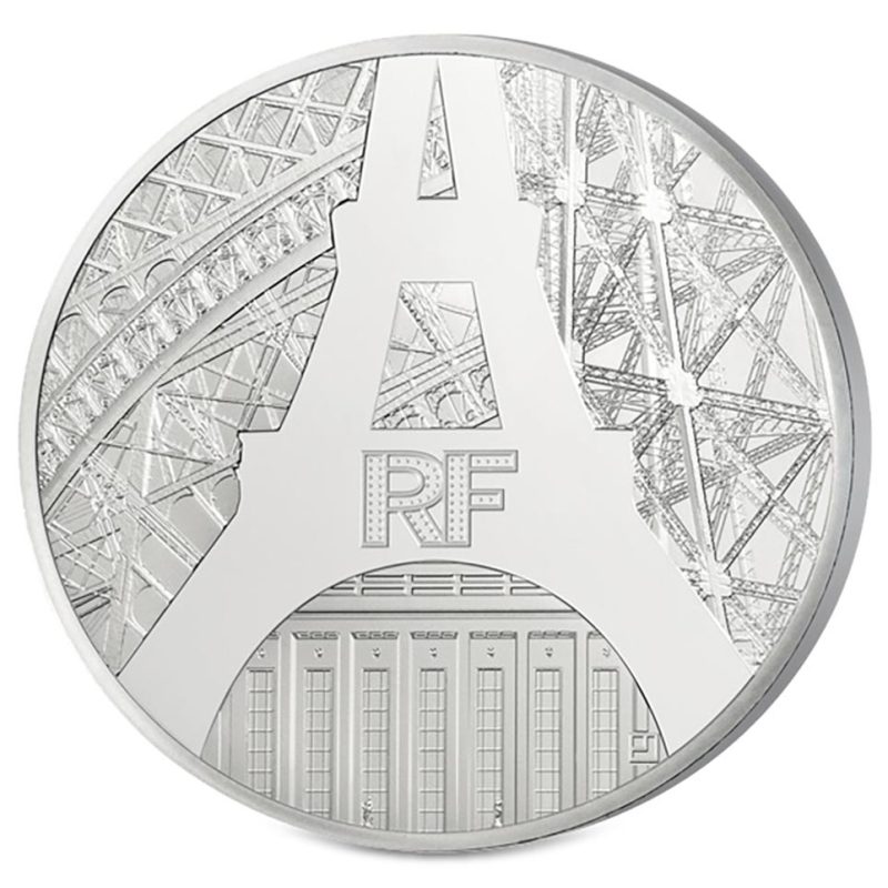 En el reverso: Representación gráfica de la silueta de la Torre Eiffel, con las iniciales «RF» como si estuvieran remachadas al primer piso.