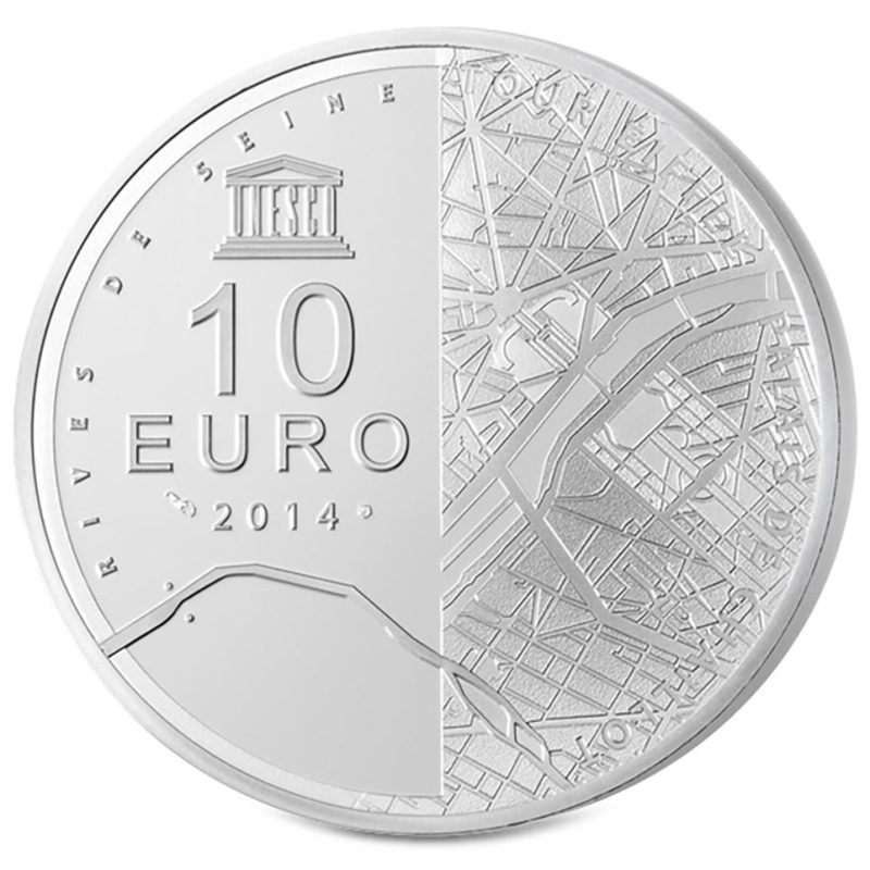 En el reverso: Mapa de París visto desde el cielo, con la ubicación de los monumentos mencionados: «Torre Eiffel - Palacio de Chaillot». El contorno del Sena, con dos puntos que indican la ubicación de los monumentos homenajeados en 2014. Logotipo de la UNESCO, valor nominal «10 euros» y año 2014.
