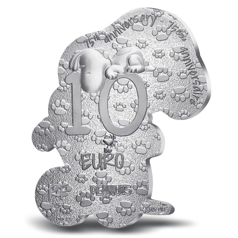 Monedas de 10€ de plata Proof, emitida para celebrar los 75 años de Snoopy.