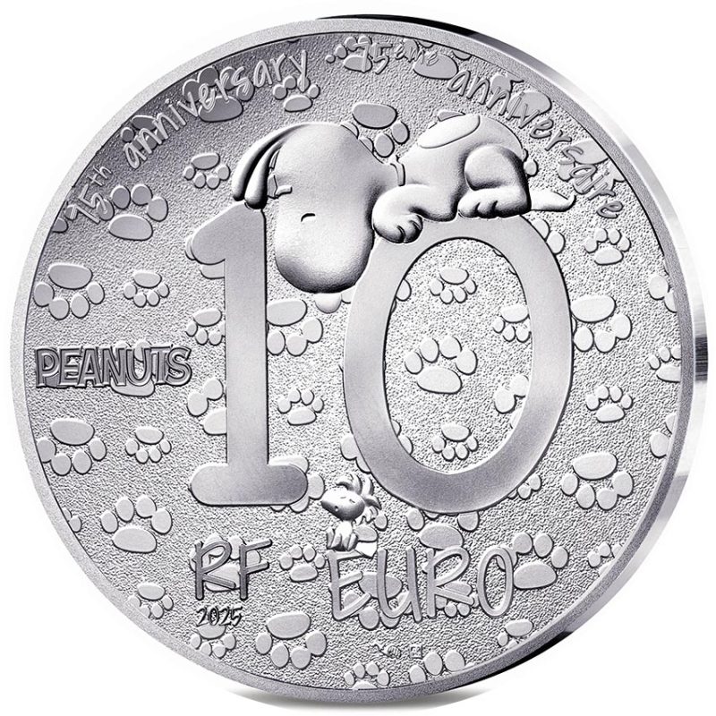 Monedas de 10€ de plata Proof, emitida para celebrar los 75 años de Snoopy.