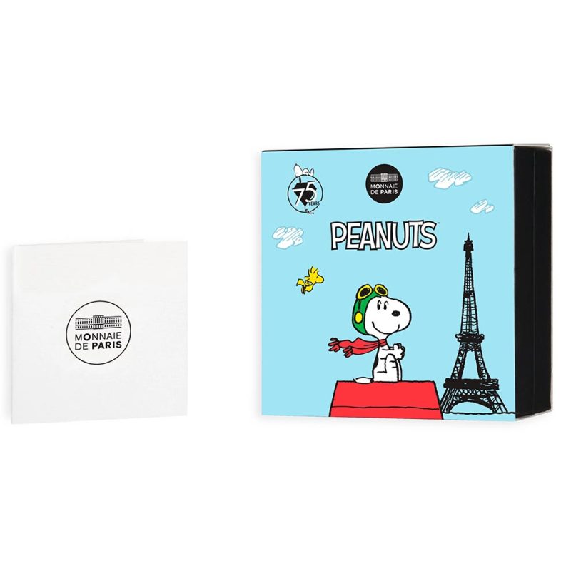Esta moneda presenta una de las poses más icónicas de Snoopy. El beagle muestra una tierna sonrisa mientras sostiene un corazón, con el número 75, en referencia al aniversario celebrado en 2025. Por primera vez, la Monnaie de Paris ofrece una moneda de color con un corazón rojo.