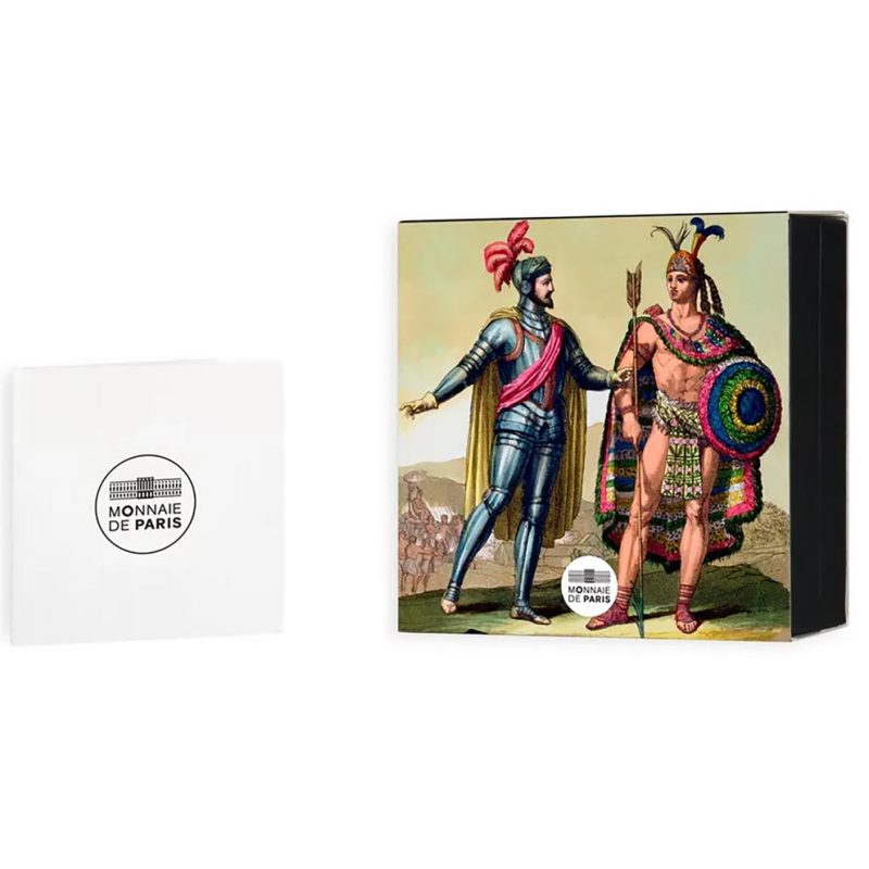 El anverso de esta moneda presenta una composición original del grabador general Joaquín Jiménez. Los dos retratos enfrentados representan a un conquistador español y a Atahualpa, el último emperador inca. En el centro, un ídolo inca dorado, "El Dorado", se yergue sobre el mítico lago donde, según se dice, un señor inca cubierto de polvo de oro ofreció al lago importantes riquezas para apaciguar a la deidad presente en el agua. Esta moneda presenta un fino dorado selectivo, evocando el mito.