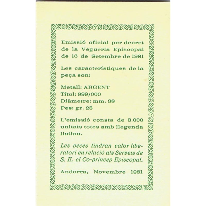 Presentada en estuche original de la Vegueria Episcopal de Andorra, con certificado.