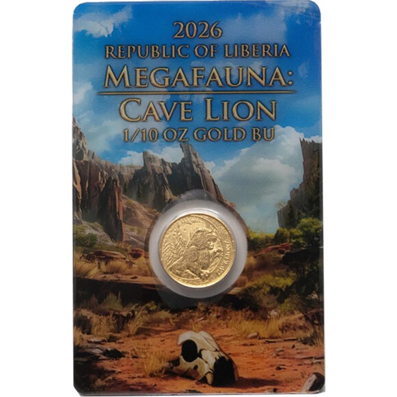 Esta moneda de 1/10 Oz Oro es parte de la serie Megafauna y está dedicada al Cave Lion, uno de los depredadores más formidables de la Europa prehistórica.