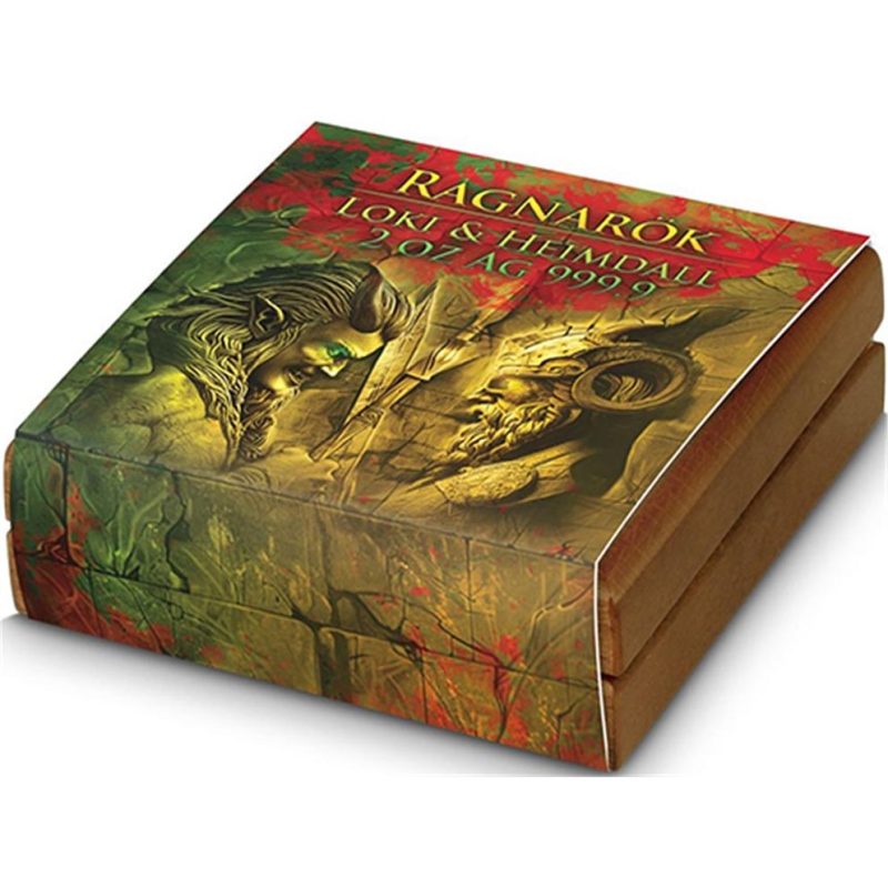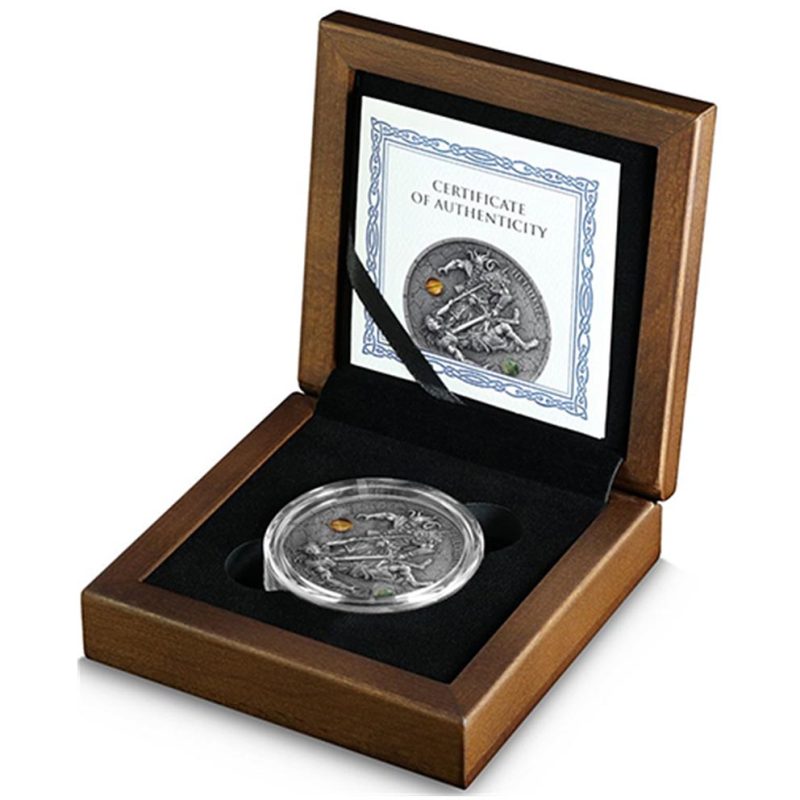 Loki y Heimdall se enfrentan en un duelo legendario que les acarreará la muerte. Loki, maestro del engaño y padre de los monstruos, se enfrenta a Heimdall, cuya aguda vista y oído no dejan escapar ni una sombra. Cuando comience su choque, ninguno sobrevivirá: su destino es la destrucción mutua. Esta moneda captura el momento predestinado en que el guardián de los dioses se enfrenta al portador de la fatalidad.