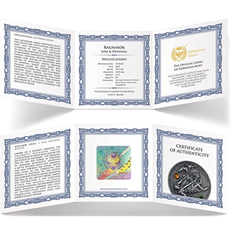 El reverso presenta los símbolos de Heimdall y Loki —sus artefactos: el barco y el cuerno— junto a una Tierra agrietada al borde de la aniquilación. También figura el águila bicéfala germánica, emblema de la Casa de la Moneda de Germania.