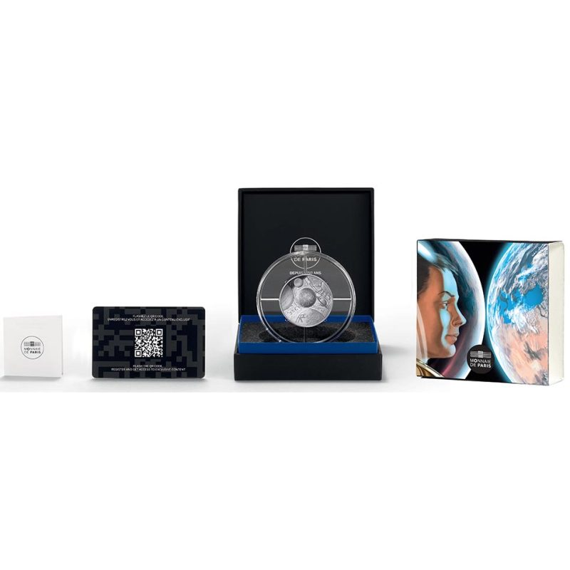 En el reverso, se reúnen los planetas del sistema solar, que interesan a la humanidad en el contexto de la odisea espacial. La Tierra ocupa la parte inferior del diseño. Sobre ella orbita la Luna, que cubre una capa de resina bajo la cual se encuentra el chip NFC integrado en la moneda. Flotando en medio de una galaxia de estrellas, encontramos también los planetas Marte, Júpiter y Saturno, unidos por líneas que trazan la trayectoria de un cohete en plena exploración. El sol extiende sus rayos por el universo desde la derecha de la composición. El valor del chip NFC reside en su identidad digital, legible por smartphone, que permite la autenticación mediante blockchain y emite un certificado digital único, así como contenido complementario exclusivo para la colección.