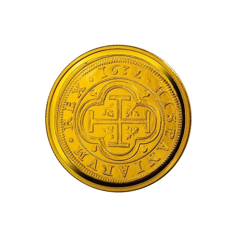 En el anverso se reproduce el anverso de una pieza de ocho escudos de Felipe IV, acuñada en 1632. Fuera del círculo central: a la izquierda, la marca de Ceca y, por encima de ella, en sentido circular ascendente y en mayúsculas, la leyenda ESPAÑA 2019; por debajo de la marca de Ceca, en sentido circular descendente y en mayúsculas, el valor de la pieza, 100 EURO. En el reverso de la moneda, ocupando todo el espacio de la misma, se reproduce el reverso de la pieza de ocho escudos de Felipe IV de 1632. Composición: Oro de 999 milésimas. Peso: 6,75 g. Diámetro: 23 mm. Tirada: 2.000 unidades. Moneda encapsulada, en caja original, con cartón exterior y certificado.