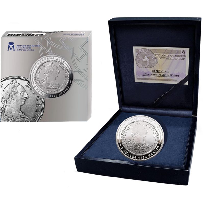 La tercera de estas piezas es una moneda de 8 reales de 1772 acuñada en la CECA de México, con la efigie de Carlos III en el anverso, siendo una de las primeras piezas de 8 reales realizadas tras la reforma monetaria de 1771.