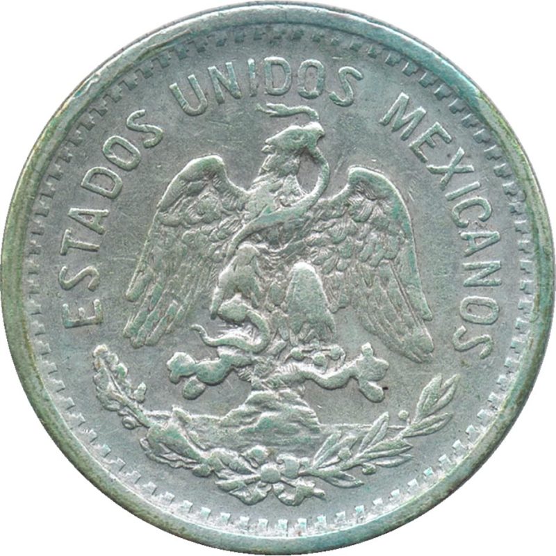 En el anverso: Escudo, águila de pie sobre un cactus en medio de un lago, con una serpiente en el pico. Sostenida por una corona de laurel y roble. Con leyenda en la parte superior.