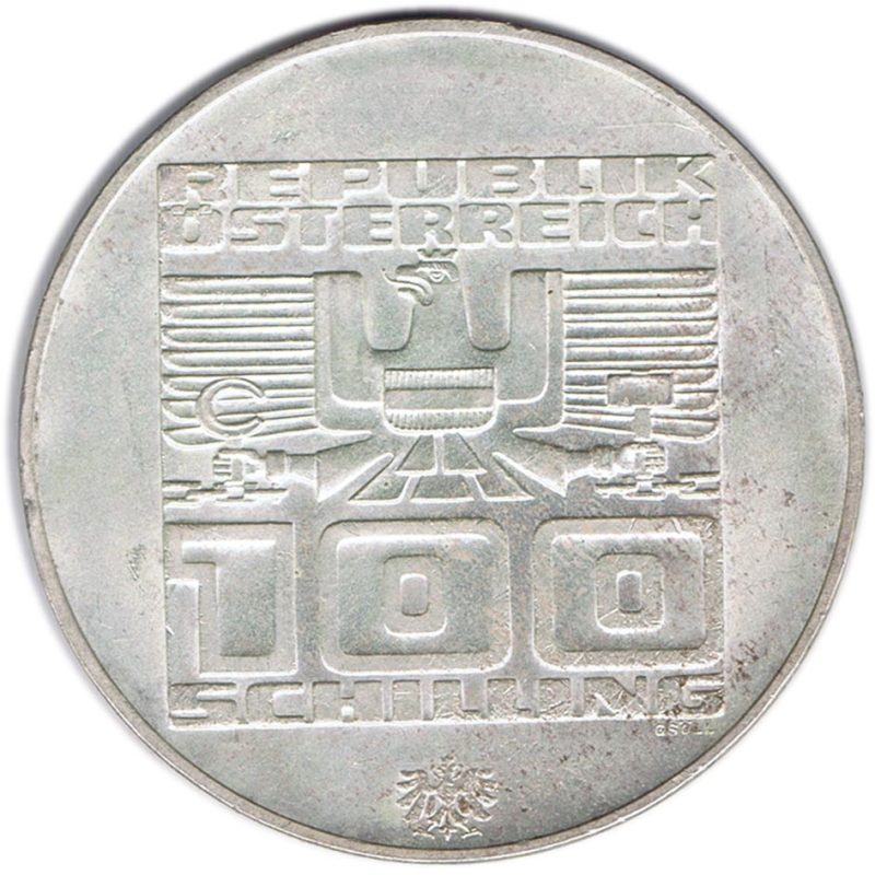 Moneda de 100 Schilling de Austria del año 1976, dedicada a los saltos de esquí en las Olimpiadas de Innsbruck.