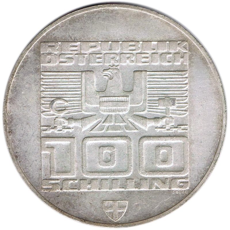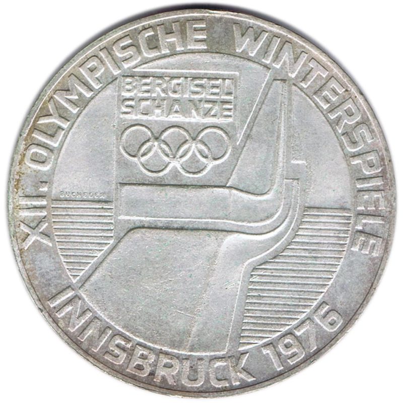 Moneda de 100 Schilling de Austria del año 1976, dedicada a los saltos de esquí en las Olimpiadas de Innsbruck.