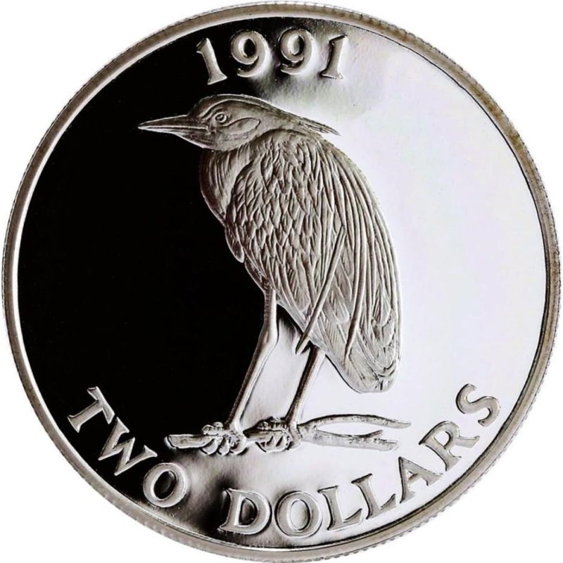 Moneda de plata 2 Dolares Bermuda 1991 Garza Amarilla.