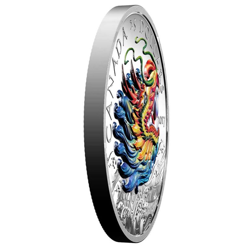 Moneda de plata fina de 25 dólares canadienses con un dragón en altorrelieve, ofrece una dimensión y profundidad incomparables, de modo que la cabeza del dragón, cuidadosamente esculpida, parece emerger de la superficie plana de la moneda y de las turbulentas olas.
