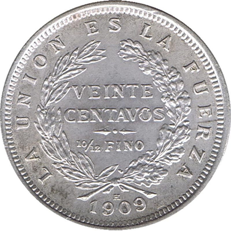 En el anverso: Leyenda "La Union es la Fuerza", Veinte centavos y año 1909.