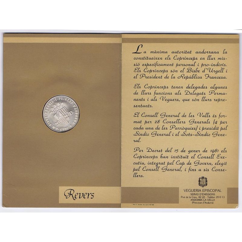 En el anverso el Escudo Coronado de Andorra, y el valor 20 D.