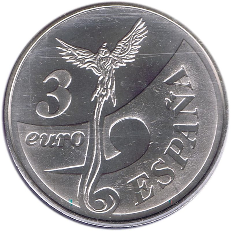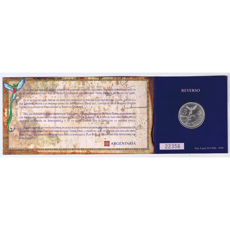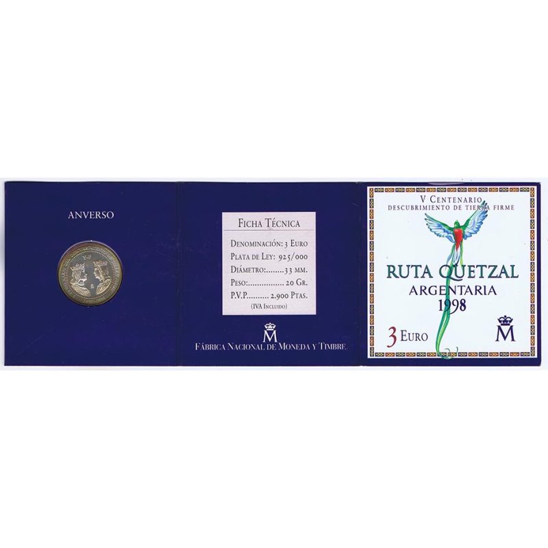 Moneda de 3 euros, dedicada al V Centenario del descubrimiento de tierra firme, a través de la Ruta Quetzal, emitida en 1998.