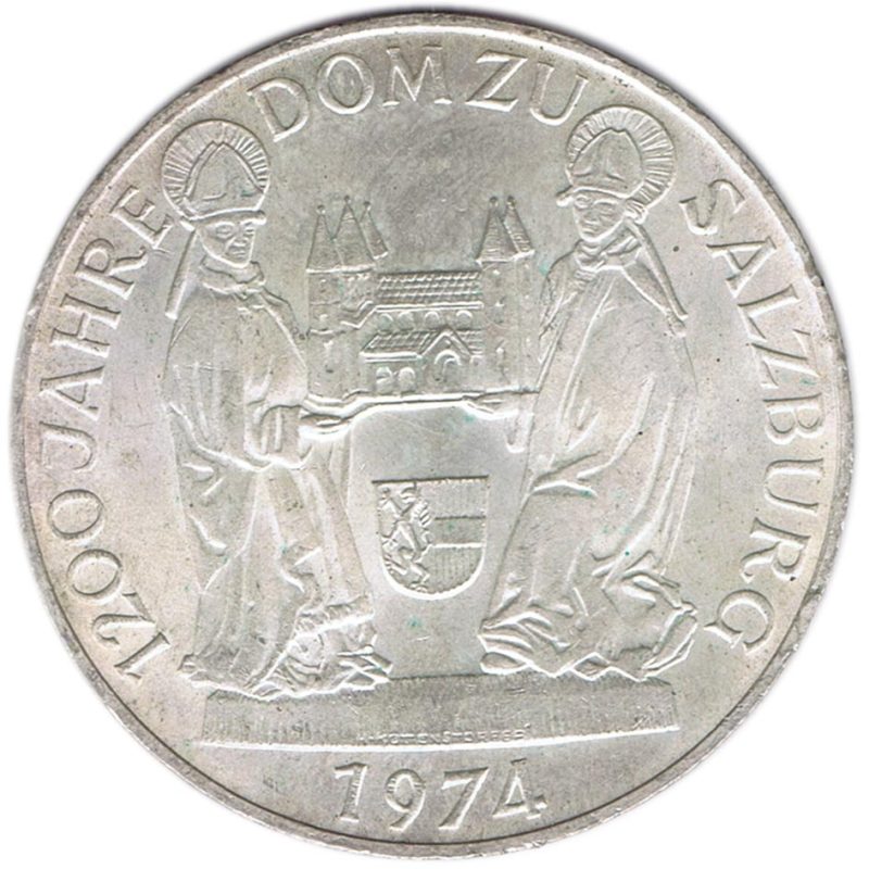 Moneda de 50 Schilling de Austria del año 1974, conmemorativa del 1200 aniversario de la Catedral de Salzburgo.