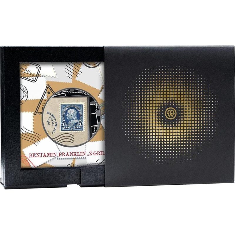 El reverso de esta prestigiosa moneda reproduce fielmente el legendario sello estadounidense "Z-Grill", emitido en 1868 como parte de una serie experimental con un diseño de rejilla en relieve, diseñado para evitar su reutilización. La variante Z-Grill, reconocible por sus impresiones horizontales, es actualmente uno de los tesoros más preciados de la filatelia mundial; solo se conservan dos ejemplares. El sello se ha recreado con una excepcional atención al detalle, incluyendo la característica rejilla y el tono azul original.