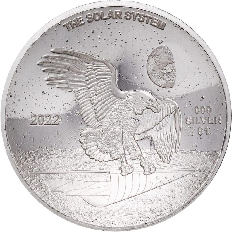 El reverso presenta al águila calva americana portando la bandera estadounidense, posada en el suelo. Detrás se puede ver la imagen de la luna. En esta cara se encuentran las inscripciones que identifican la moneda: el año de emisión, el contenido de metal, la pureza y el valor nominal. Y sobre el águila, el nombre de la serie: “The Solar System”.