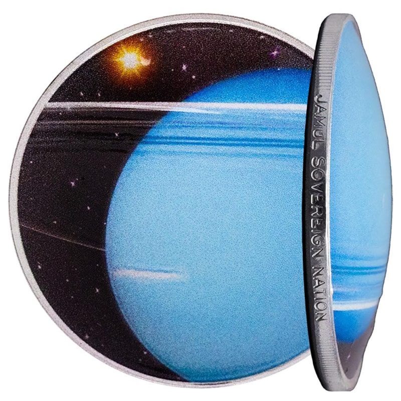 En esta edición, Urano. La moneda tiene forma de cúpula, presenta una hermosa coloración, tiene calidad Proof y viene en una cápsula.