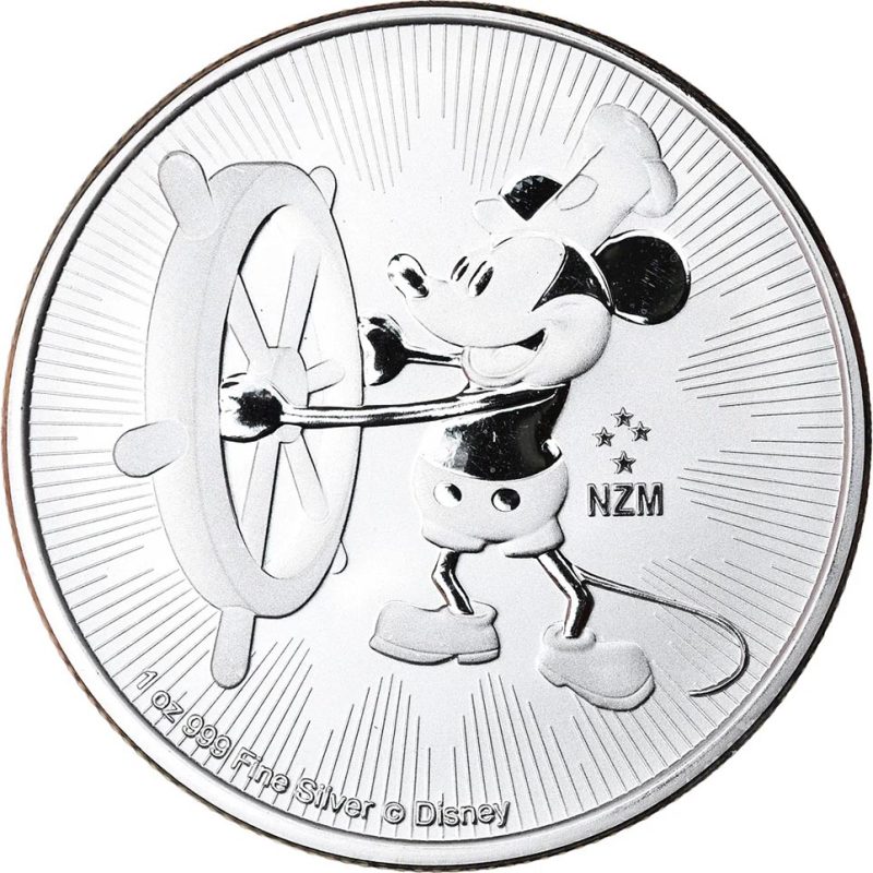 Moneda de plata fina de 999 milésimas, que representa a Mickey Mouse cogiendo el timón de un barco.