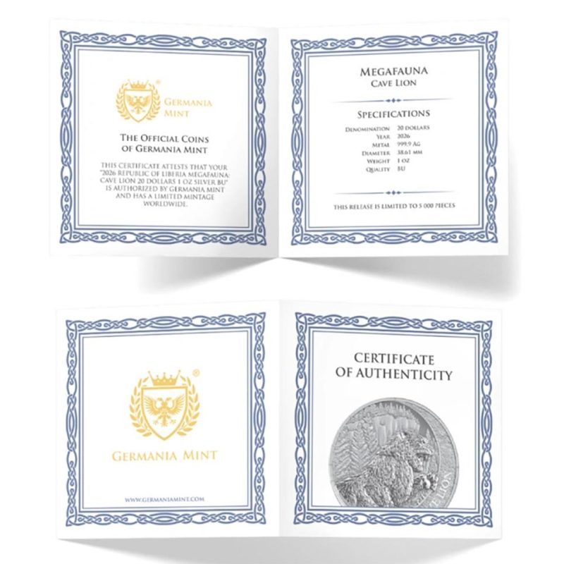 La emisión de 2026 representa al león cavernario, uno de los depredadores más poderosos del mundo prehistórico, que habitó vastas zonas de Europa y Asia hace miles de años. La moneda, acuñada en 1 onza de plata fina 999.9, representa una combinación de simbolismo natural puro y la moderna artesanía de acuñación de Germania Mint. El diseño de Kinga Sabatowicz es una interpretación artística de la fuerza, el instinto y las leyes inflexibles que rigen la naturaleza ancestral. La serie Megafauna está concebida como una colección estilísticamente coherente, con sucesivas especies unidas por motivos gráficos comunes.
