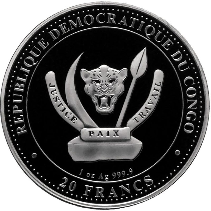 El megalodón fue un enorme tiburón prehistórico que vivió hasta hace aproximadamente 2,6 millones de años. Con una longitud estimada de hasta 18 metros, fue uno de los mayores peces depredadores de la historia de la Tierra. Sus dientes podían superar los 18 cm de longitud, lo que sugiere que probablemente cazaba grandes mamíferos marinos como ballenas. Según el conocimiento científico actual, el megalodón se extinguió, probablemente debido al cambio climático y la escasez de alimento. El anverso de la moneda de plata presenta el escudo de armas de la República del Congo, junto con detalles sobre su valor nominal, peso y pureza de plata.