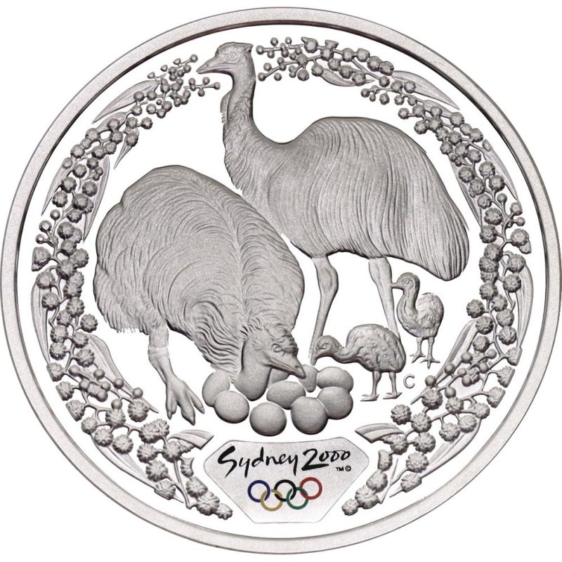 El reverso de la moneda presenta un impresionante diseño de un emú y una acacia, símbolos de la flora y fauna únicas de Australia y el logotipo de los Juegos Olímpicos a color en la parte inferior.
