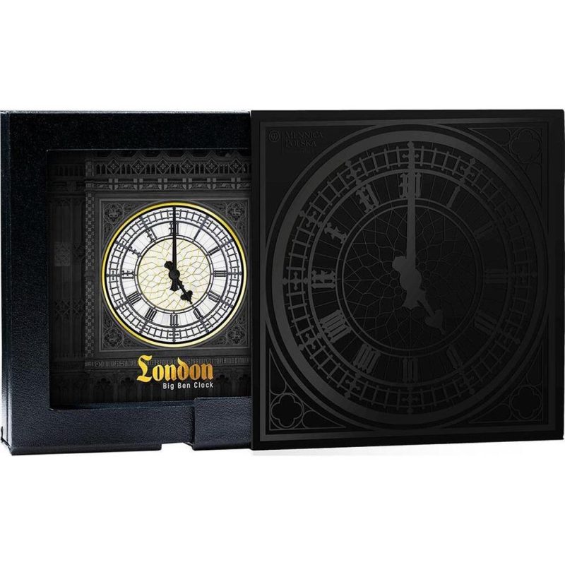Moneda de colección excepcional que representa el famoso reloj Big Ben de Londres, símbolo de la ciudad que marca el tiempo desde 1859. La moneda está acuñada en una onza de plata pura 999 y pertenece a la prestigiosa serie Town Hall Clocks. Con detalles en color y precisión en la esfera, cada ejemplar captura un fragmento único de la historia de Londres.