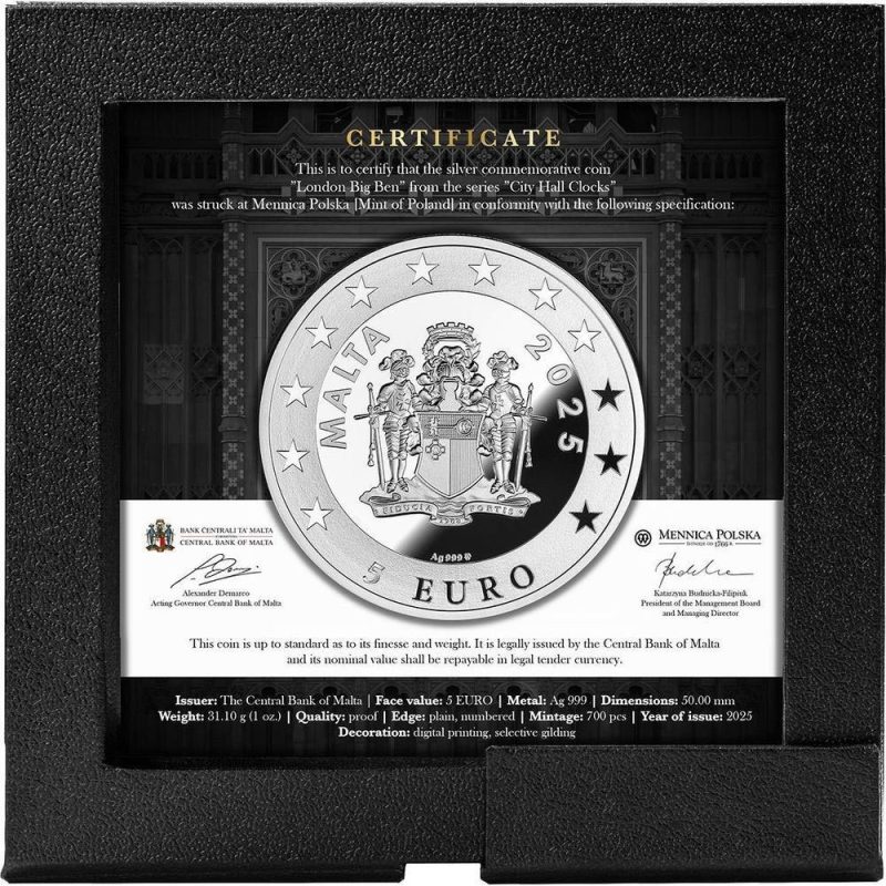 Moneda onza de plata 5 Euro Malta 2025 Reloj Big Ben.