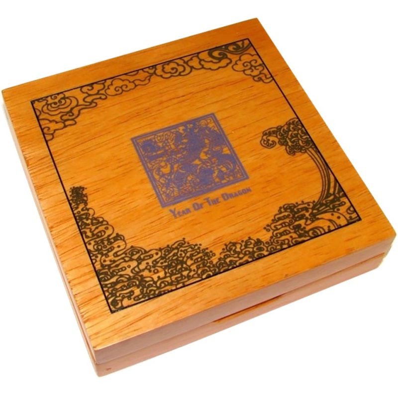 La moneda de plata "Prosperidad traída por el dragón" viene encapsulada y se presenta en un elegante estuche de madera, acompañada de un Certificado de Autenticidad.
