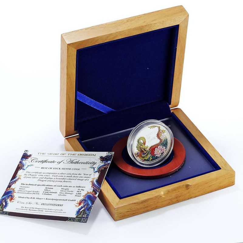 La moneda de plata "BEST OF LUCK" viene encapsulada y se presenta en un elegante estuche de madera, acompañada de un Certificado de Autenticidad.