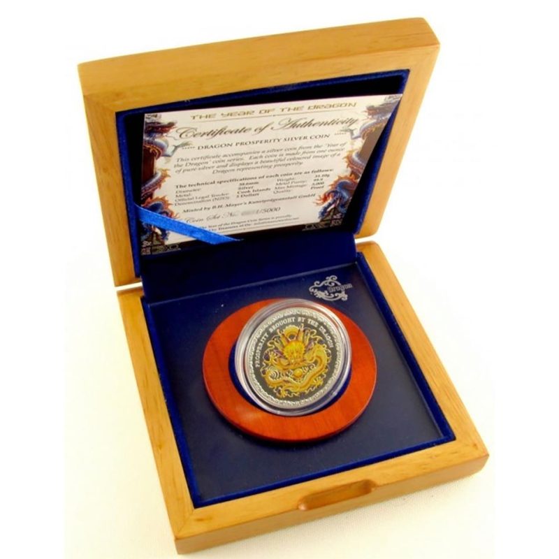 La moneda de plata "Prosperidad traída por el dragón" viene encapsulada y se presenta en un elegante estuche de madera, acompañada de un Certificado de Autenticidad.