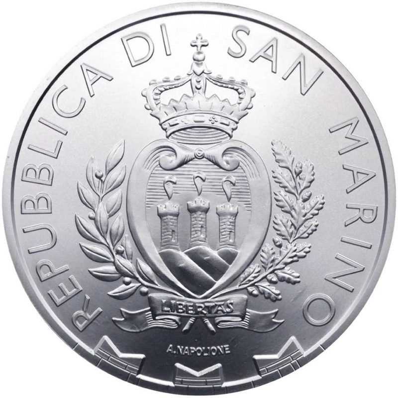 Reverso: escudo de armas de San Marino, con la imagen de las Tres Torres.