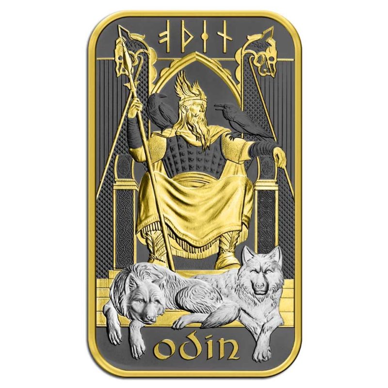 Lingote de la serie Norse Gods, una combinación de plata de la más alta calidad y un diseño único de The Royal Mint, envuelto en un elegante envoltorio de Germania Mint. La moneda está ennoblecida con rutenio y oro.