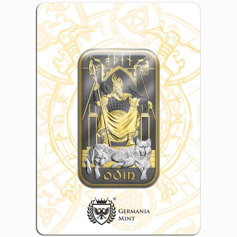 Cada lingote de plata de la serie Norse Gods está empaquetado de forma segura en el distintivo Cardbar diseñado y producido por Germania Mint, no solo para su protección, sino también para realzar su valor coleccionable. El empaque presenta diseños intrincados inspirados en la mitología nórdica, incluidas runas y símbolos estrechamente vinculados a Odín, quien descubrió sus secretos y los usó como fuente de poder y conocimiento.