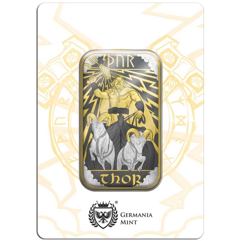 El diseño épico de este lingote de plata representa a Thor en una pose de poder divino; blande Mjolnir, su fiel martillo, sobre su cabeza mientras controla los rayos del cielo. Su cinturón de fuerza, conocido como Megingjard, adorna su abdomen, y Thor conduce su carro tirado por dos machos cabríos llamados Tanngniost (el que rechina los dientes) y Tanngrisnir (el que enseña los dientes).